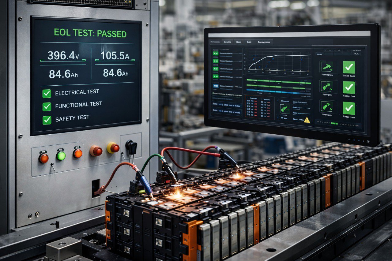 End-of-Line testing validates electrical, functional, and safety performance before pack integration.
